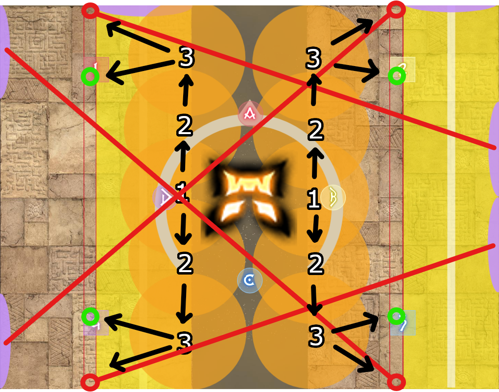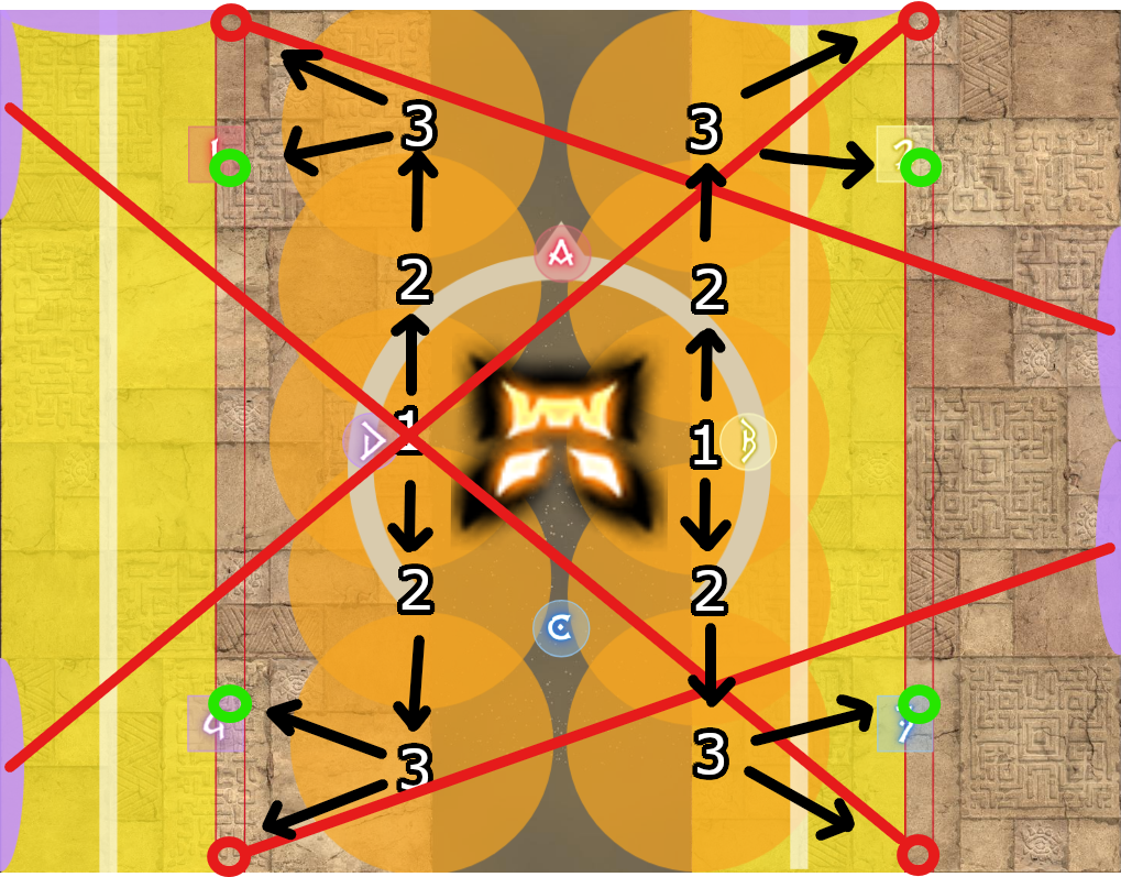 As a reminder, the waymark inner safe spots are for the non-tethers, while the edges of the arena are for the tethered players. In the diagrams below, the safespots are marked with red and green circles respectively.