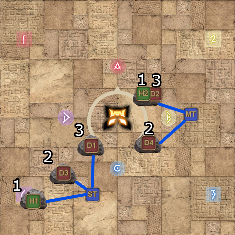 The rock droppers will be done in the following order: Healer > Ranged > Melee. The MT group is responsible for placing the three rocks in a line at southwest to stop the Triple Tyrannhilation, while the ST group are responsible for dropping the rocks at the east side which will be used to deal with the Fearsome Fireball wild charges. There are no tankbusters or rocks available on the first set, so for the first Fearsome Fireball, both tanks should be at the front of the stack party in order to soak the wild charge.