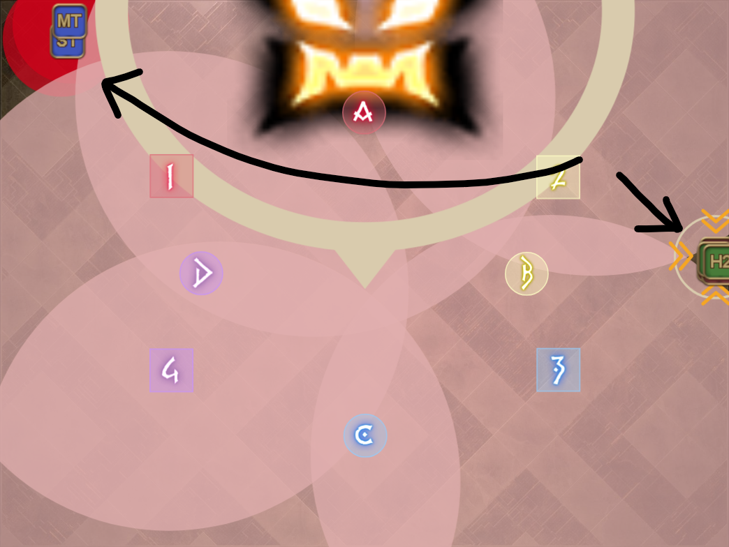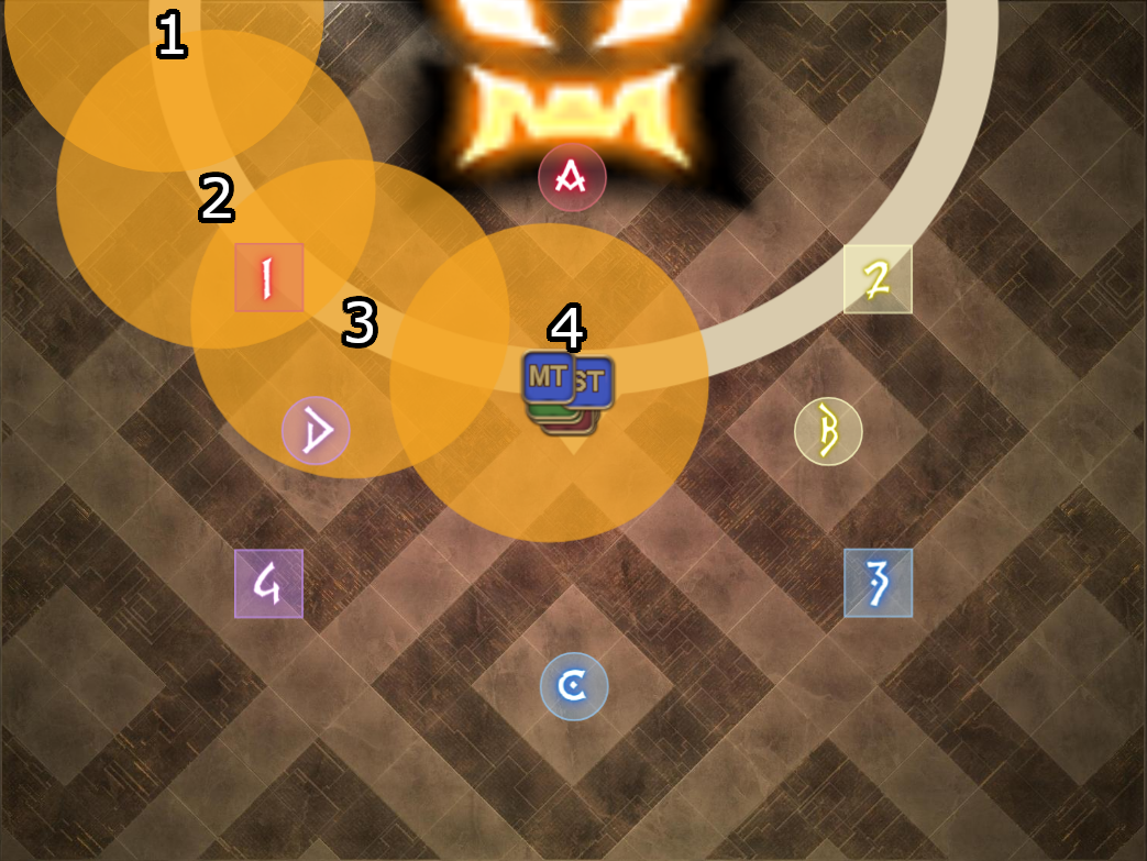 | 3. | After resolving the debuffs, one non-tank will be targeted by a stack, while both tanks will be targeted by an AoE tankbuster. At the same time, the arena will be littered with blobs which will explode in large AOEs soon. No matter how the blobs spawn, theres always one safe spot on each edge of the arena. The nontanks will resolve their stack on the same side as where they resolved their debuffs, while the tanks will always adjust by moving to the other side. The tankbuster does not inflict any form of vulnerability and it is actually quite weak by itself, so it is safe to stack both tanks on top of each other provided they have sufficient mitigations. Something like 40% + short mitigation + Reprisal should be sufficient enough to survive. The AoEs in the arena will explode half a second earlier than the tankbuster, so with proper timing, it is actually possible to also spread out without overlapping the tankbusters! | ![]() ![]() |