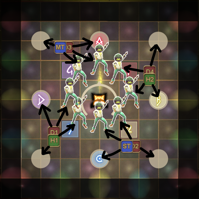 Overally, not a hard mechanic, but everyone needs to know their positions if the party wants to pass this mechanic without casualties. The four frogs and the four spotlights can all spawn either intercardinally or cardinally, so for this mechanic, the default clockspot will be used, with the support and DPS swapping around as needed for their role. Below is an image of all the possible spotlights and frogs spawn locations, and the player assignments of said entities.