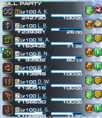 Now, if you're following game8, then make sure its green first, yellow second. After that, there are two approaches to identifying whether it is your turn or not to cleanse. You can either look at your party list, identify all the player with the same debuffs and use process of elimination to determine when it is your turn to cleanse. Alternatively, you can just check whether your own timer is 20s or lower every time a line AoE is about to go off, which is the method that requires less brainpower to execute.