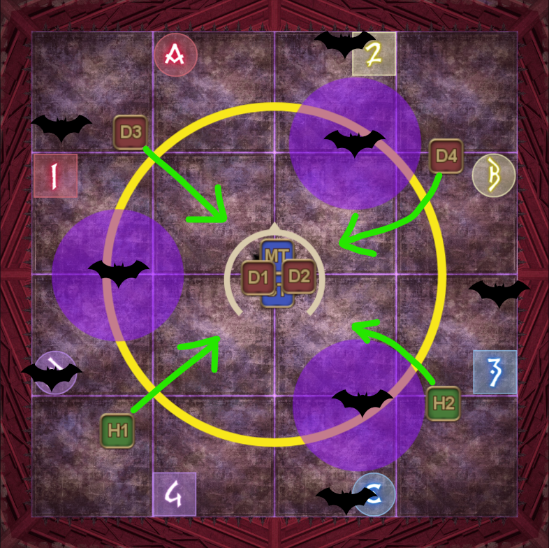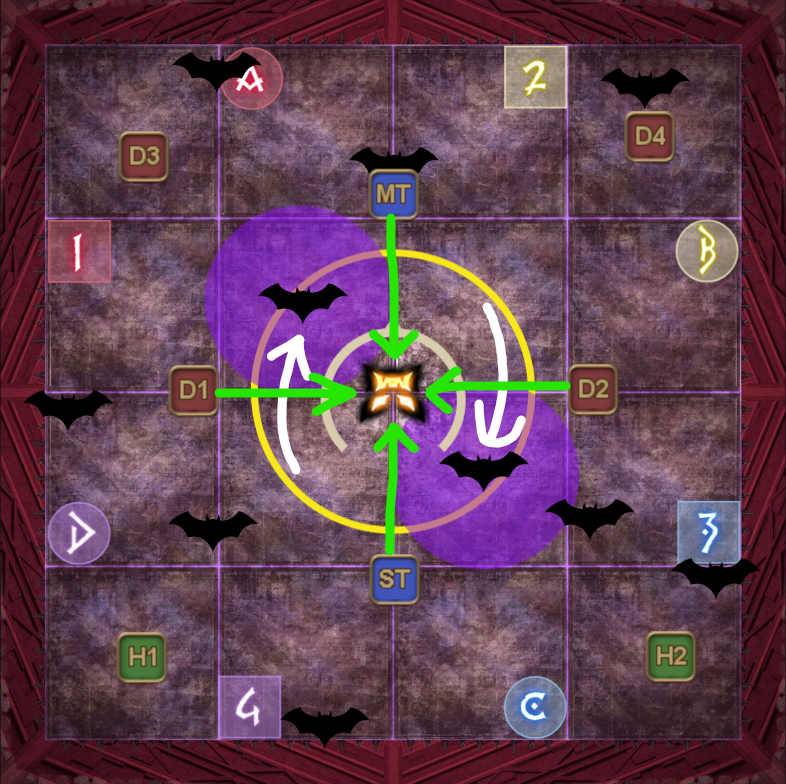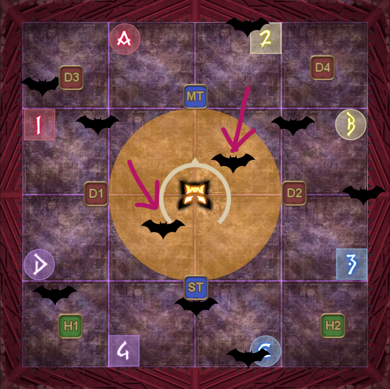 | 3. | As for the ranged players in each corner, dodge the 2nd set of bat explosions first by using your eyes to see whether you have to dodge left or right. Once the explosion has been dodged, you can safely enter the sonar and resolve your bomb debuff. The third set of bats can be completely ignored once you've reached the center of the arena. | ![]() |